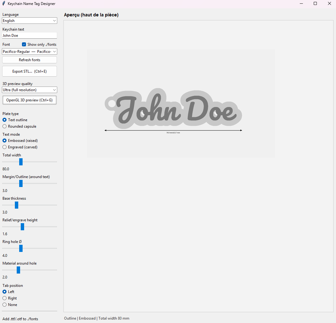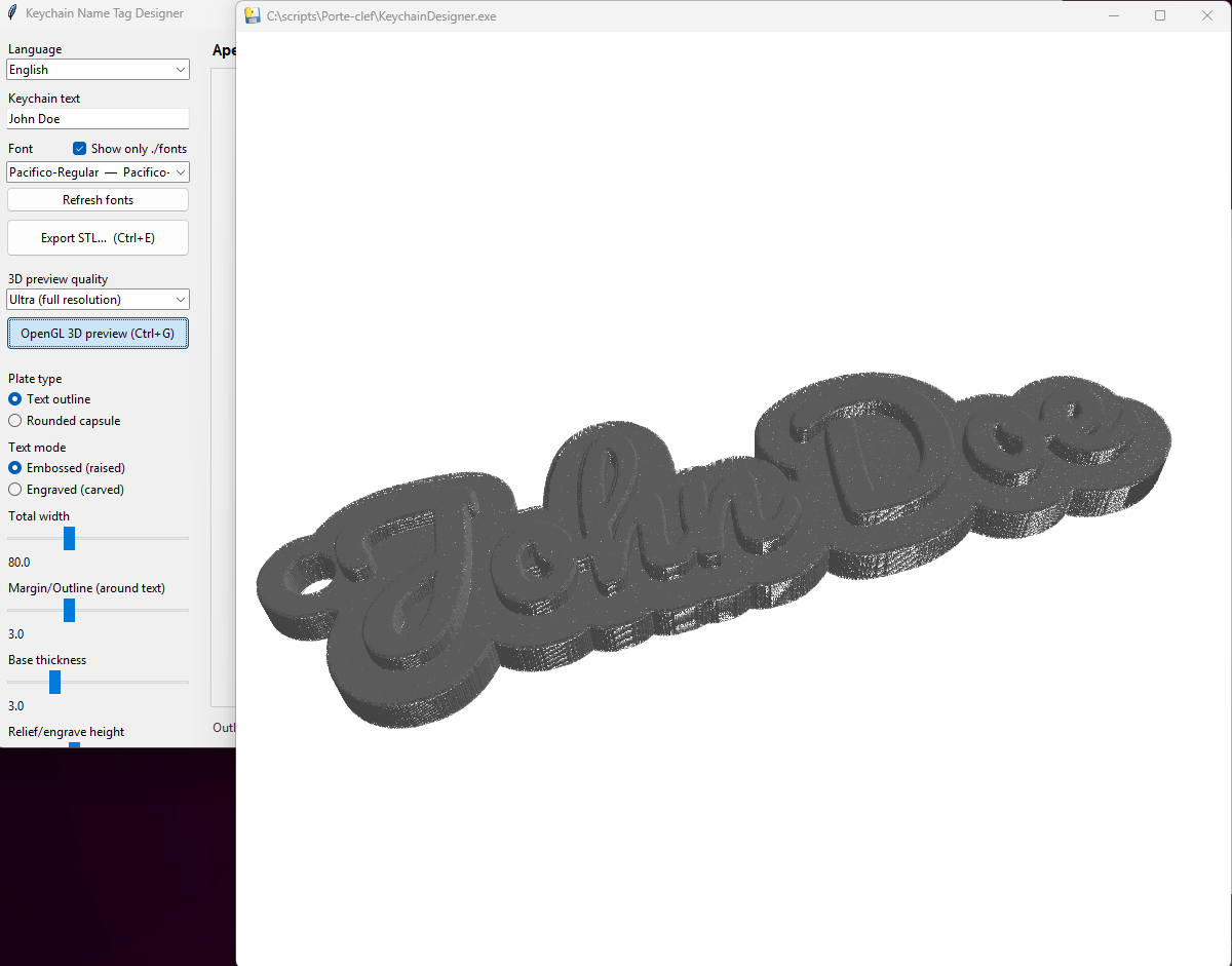 PorteClef3D is a simple and intuitive software that allows you to generate STL files with custom text, fonts, and styles in just a few clicks.